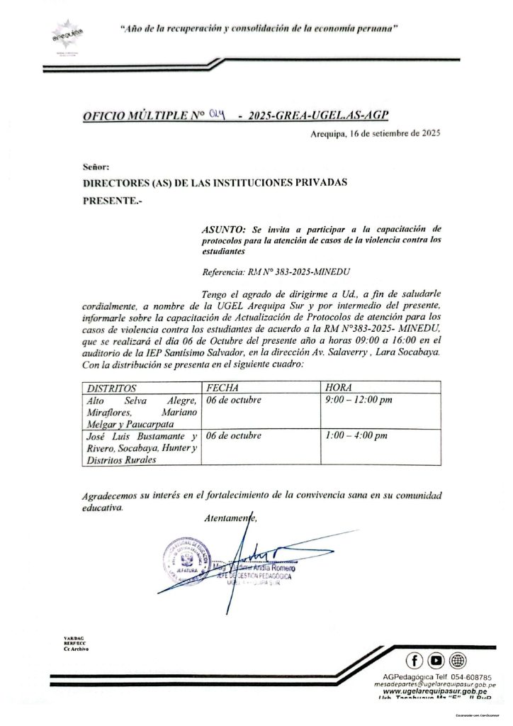Previous article COMUNICADO – OFICIO MÚLTIPLE N° 025 – 2025-GREA-UGEL.AS-AGP: SE INVITA A PARTICIPAR A LAS CAPACITACIONES DE PROTOCOLOS PARA LA ATENCIÓN DE CASOS DE LA VIOLENCIA CONTRA LOS ESTUDIANTES