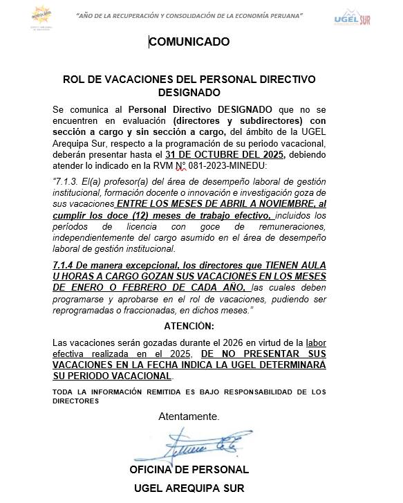 La UGEL Arequipa Sur informa al personal directivo designado (directores y subdirectores, con o sin sección a cargo) que deberán presentar su programación de vacaciones 2025 hasta el 31 de octubre del presente año, conforme a lo establecido en la RVM N° 081-2023-MINEDU.