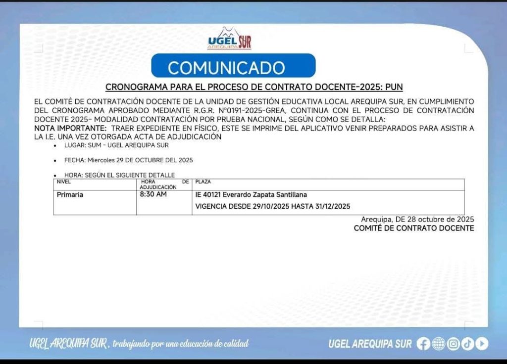 Previous article COMUNICADO N° 040- 2025: ENCARGATURA DE PROFESORES EN ÁREA DE DESEMPEÑO LABORAL DE LA LEY 2944 LEY DE LA REFORMA MAGISTERIAL