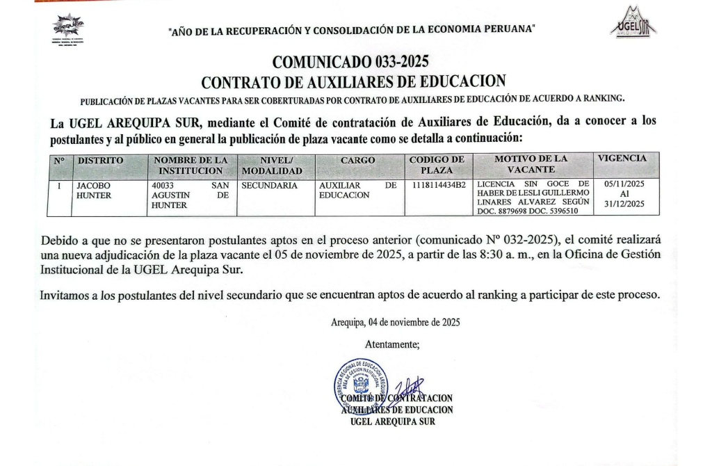 • COMUNICADO 003-2025 – CONTRATO DE AUXILIARES DE EDUCACIÓN.